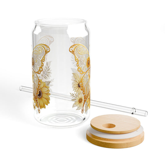 Butterfly Garden Sipper Glass - 16oz with Bamboo Lid, Gold Colored Butterfly with Flowers, Birthday Gift, Butterfly Gift, Butterfly Glassware